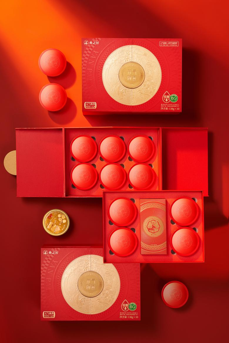 為長(zhǎng)輩挑選滋補(bǔ)好禮,煥新升級(jí)的碗燕·元?dú)饪疃Y盒實(shí)為優(yōu)先之選。中國(guó)紅與黃金色系的精美配搭,凸顯光亮色澤與尊貴質(zhì)感,大方得體,有禮有面。禮盒設(shè)計(jì)圍繞“圓”的概念,以年輪為設(shè)計(jì)意象,象征歲月賦予的智慧,也傳遞著圓滿之意。盒上刻畫金燕反哺動(dòng)人圖景,祥云繁花環(huán)繞其中,蘊(yùn)藏濃厚情意。獨(dú)特的對(duì)稱開盒頗具巧思與創(chuàng)意,內(nèi)里雙層設(shè)計(jì),共承十碗珍饈碗燕·元?dú)饪?,滿載濃濃營(yíng)養(yǎng)與深切關(guān)懷,讓滋補(bǔ)觸手可及,關(guān)愛無處不在。